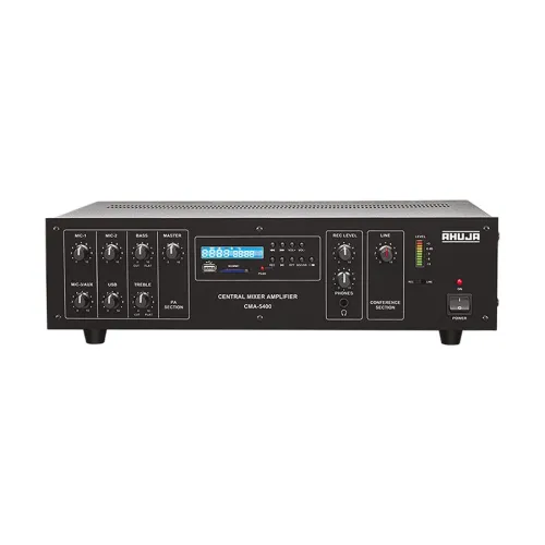 The Ahuja CMA-5400 Central PA Mixer Amplifier Conference System is a premium-grade audio control hub tailored for professional conferencing setups requiring high clarity, centralized management, and scalable connectivity. With a powerful 240-watt RMS output, this PA system ensures consistent, distortion-free sound distribution across large venues such as corporate boardrooms, government chambers, and academic auditoriums. The Ahuja CMA-5400 features intelligent priority override for microphones, automatic mic activation, and balanced audio inputs for seamless integration with external sources. Its built-in digital recorder compatibility and line output options make it ideal for archiving meetings or broadcasting sessions. Designed for durability and ease of use, the Ahuja PA system includes LED indicators, volume controls for each channel, and a rugged metal chassis that withstands intensive daily use. Whether you're upgrading an existing conference room or building a new AV infrastructure, the Ahuja CMA-5400 offers unmatched reliability, speech intelligibility, and operational simplicity making it a top-tier choice for modern communication environments.
