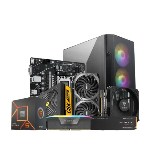The AMD Ryzen 5 7500F Budget Gaming PC is a powerhouse designed for gamers seeking high performance without breaking the bank. At its core is the AMD Ryzen 5 7500F processor, featuring 6 cores and 12 threads with a base clock speed of 3.7 GHz, boosting up to 5.0 GHz, built on advanced 5nm technology. This is paired with the Asus PRIME A620M-K AM5 mATX Motherboard, which supports DDR5 memory and offers robust features like Core Boost and multiple connectivity options. The system includes 16GB of Corsair VENGEANCE 16GB DDR5 6000MHz CL28 Desktop RAM running at 6000MHz with low latency, ensuring smooth multitasking and quick load times. Graphics are handled by the MSI GeForce RTX 3060 VENTUS 2X OC, equipped with 12GB of GDDR6 memory, delivering excellent performance for 1080p gaming with real-time ray tracing and AI-enhanced graphics. Storage is swift and ample with the Western Digital Black SN770 500GB M.2 2280 PCIe Gen4 NVMe SSD, providing read/write speeds up to 5000/2500 MB/s for rapid boot times and game loading. The system is powered by the Antec CSK 650DC 650W 80+ Bronze Non-Modular Power Supply, ensuring efficient and reliable power delivery. Cooling is managed by the Gamdias ST-BOREAS E1-411 SE CPU Air Cooler, featuring a digital display, four copper heat pipes, and a 120mm PWM fan for effective heat dissipation. All these components are housed in the MSI MAG FORGE M100A Micro ATX Tower Gaming Case, which offers a panoramic view with its tempered glass panels and comes pre-installed with five RGB fans for optimal airflow and aesthetics. This combination of high-performance components ensures a powerful and efficient system suitable for gaming, content creation, and multitasking.