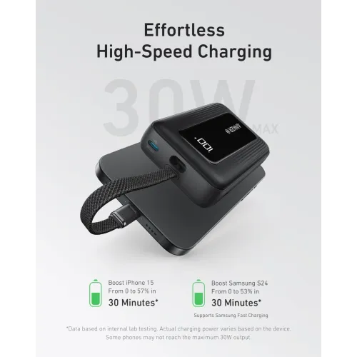 The Anker Zolo 30W 10000mAh Power Bank is a premium, all-in-one charging solution designed for tech-savvy users who value speed, portability, and intelligent design. Engineered with a powerful 10,000mAh lithium-polymer battery, it delivers up to 30W of bi-directional fast charging through its integrated 5.4-inch USB-C cable, eliminating the need for extra cords while ensuring rapid power delivery for smartphones, tablets, and USB-C accessories. Its standout feature is MagSafe-compatible magnetic wireless charging, offering up to 7.5W for Qi-enabled devices—perfect for iPhone users seeking cable-free convenience. The Anker Zolo 10000mAh power bank also includes a built-in magnetic stand, allowing hands-free viewing during video calls, streaming, or browsing. With graphene heat dissipation technology, it maintains safe operating temperatures even during high-output sessions, while real-time protection safeguards both the device and user. The ergonomic L-shaped cable design reduces strain on device ports, and the dual charging modes support simultaneous wired and wireless charging. Compact, lightweight, and travel-ready, the Zolo 30W power bank fits easily into pockets or bags, making it ideal for commuters, remote workers, and frequent travelers. Its universal USB-C compatibility ensures seamless integration with a wide range of devices, while the sleek matte finish and minimalist design complement any tech setup. Whether you're powering up on the move or managing multiple devices throughout the day, the Anker Zolo 30W 10000mAh Power Bank offers a reliable, stylish, and efficient way to stay charged and connected.