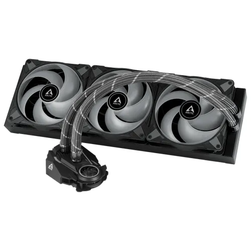 Higher efficiency and quieter operation are features of the Arctic Liquid Freezer II 420 A-RGB Liquid CPU Cooler. Additionally, the water pump's speed is adjusted by PWM control. This results in much lower power consumption for all AiO components as well as much lower noise levels for low and normal loads.