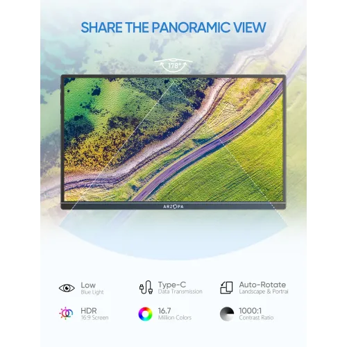 The Arzopa A1S 14" FHD IPS Portable Monitor is a sleek, travel-ready screen that provides clarity, ease of use, and broad compatibility wherever you go. The Arzopa A1S 14" FHD IPS Portable Monitor is a great travel companion for busy professionals and regular travelers. It has a tiny 0.16-inch profile and weighs only 1.1 pounds, making it easy to take to work, school, or for fun on the go. The 14-inch Full HD IPS panel has a sharp 1920x1080 resolution, a balanced 6800K color temperature, and wide 178-degree viewing angles that make it easy to see in both horizontal and vertical orientations. The Arzopa A1S 14" FHD IPS Portable Monitor has a clear anti-glare screen and a 45% NTSC color gamut, which means that the display is smooth for browsing, meetings, and streaming. The Arzopa A1S 14" FHD Portable Monitor has a contrast ratio of 800:1 and a brightness of 250cd/m², so it always shows good pictures inside. It also has built-in speakers that make it easy to listen to audio for everyday multimedia use. There is a Mini HD port for video input and a Type C full function port that enables power, video data, and plug-and-play ease. This means that users may connect with just one cable. The Arzopa A1S 14" IPS Portable Monitor works with various laptops from Apple, Huawei, Microsoft, ASUS, Lenovo, Dell, HP, and others. This makes it great for use at home or in the workplace. It also works with famous smartphones from Samsung, Huawei, Sony, and Razer. However, iPhone users will need a Lightning to HDMI adaptor. The Arzopa A1S Portable Monitor works with gaming consoles including the Switch, Xbox, PS4, PS5, and Steam Deck. It has a refresh rate of 60Hz, so you can always see the same thing. The Arzopa Portable Monitor is a great second screen for travel, work, and enjoyment because it is lightweight, can be used in a variety of ways, and works with a wide range of devices.