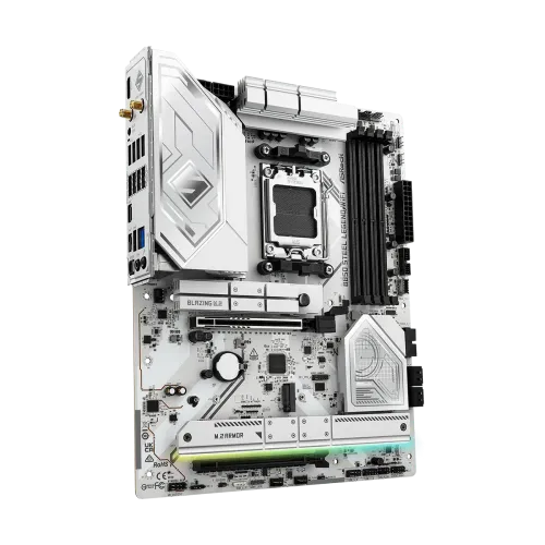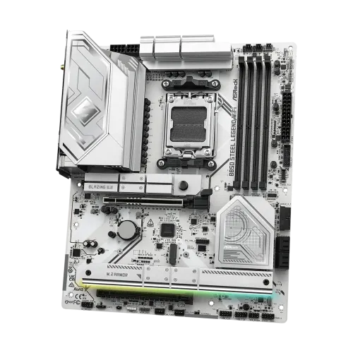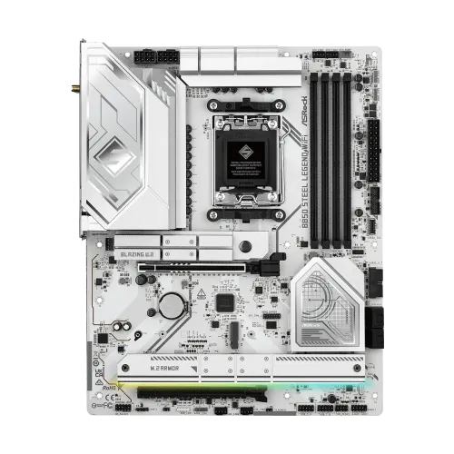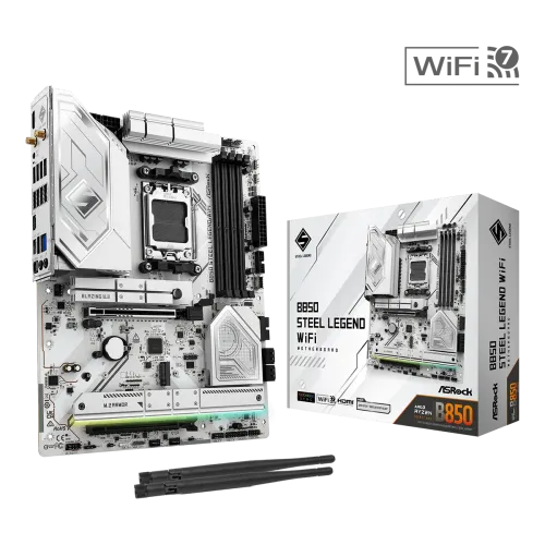 The ASRock B850 Steel Legend WiFi AM5 DDR5 ATX Motherboard is ideal for gamers, creators, and professionals constructing next-generation PCs. It provides exceptional performance, durability, and connectivity. Powered by the AMD B850 chipset, it supports AMD Socket AM5 Ryzen 9000, 8000, and 7000 Series processors, as well as PCIe Gen5 graphics and blazing M.2 storage, providing future-ready speed and efficiency. ASRock B850 Steel Legend WiFi AM5 DDR5 ATX Motherboard features two channel DDR5 memory technology, four DIMM slots, and supports both ECC and non-ECC un-buffered modules with speeds up to 8000+(OC), as well as XMP and EXPO profiles for easy overclocking. The 14+2+1 power phase architecture, featuring 80A Dr.MOS, expanded heatsink protection, and 20K long-lasting black capacitors, assures rock-solid stability and extended endurance. For graphics, the ASRock B850 Steel Legend WiFi AM5 DDR5 ATX Motherboard with AMD RDNA solutions supports HDMI 2.1 with HDR, HDCP 2.3, and 4K 120Hz output. The audio is driven by the Realtek ALC4082, which features 7.1 channel HD sound, distinct PCB layers for clean signal separation, direct drive headphone technology that supports up to 600 Ohm headsets, and Nahimic software for an immersive experience. Networking is optimized with 2.5G Dragon LAN, which includes bandwidth management, visual statistics, and customizable priority modes, and wireless performance is improved by a WiFi 7 802.11be module with Bluetooth 5.4, dual-band 2x2 MU-MIMO, extended 6GHz band support, and up to 160MHz channel bandwidth. The ASRock B850 Steel Legend WiFi AM5 DDR5 ATX Motherboard provides storage options with one PCIe Gen5x4 blazing M.2 slot, three PCIe Gen4x4 M.2 slots, and four SATA3 ports that support RAID 0, 1, and 10 for NVMe SSDs. The expansion comprises PCIe 5.0 x16 and PCIe 4.0 x16 slots with strengthened connections. USB connectivity is extensive, with USB 3.2 Gen2x2 Type-C, several USB 3.2 Gen2 and Gen1 ports, and eight USB 2.0 options on the back and front panels. Other features include BIOS Flashback, ASRock Auto Driver Installer, Post Status Checker, Polychrome SYNC RGB control, lightning gaming ports, and extensive fan and AIO pump headers. The ASRock B850 Steel Legend WiFi, with its versatile integrated I/O shield, ATX 8-layer PCB design, and compatibility for Windows 10 and 11, delivers power, stability, and sophisticated connectivity for high-performance PC designs.