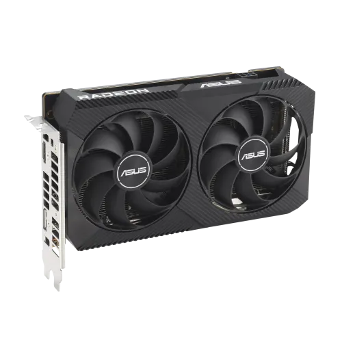 The ASUS Dual Radeon RX 6500 XT V2 OC Edition 4GB GDDR6 graphics card is designed to provide smooth 1080p gaming performance, compact construction, and efficient cooling. Powered by the AMD Radeon RX 6500 XT GPU, this OC version has a boost clock of up to 2820 MHz and a game clock of up to 2670 MHz in OC mode, providing a consistent performance improvement in demanding titles. The ASUS Dual Radeon RX 6500 XT V2 OC Graphics Card has 1024 stream processors and 4GB of high-speed GDDR6 video memory running at 18 Gbps over a 64-bit memory interface, allowing for responsive gameplay and faster rendering times. With PCI Express 4.0 support and OpenGL 4.6 compatibility, it is designed to handle latest games and programs seamlessly. The ASUS Dual Radeon RX 6500 XT V2 OC Edition 4GB GDDR6 Graphics Card delivers a maximum digital resolution of 7680 x 4320, making it ideal for high-definition screens. It has one HDMI 2.1 port and one DisplayPort 1.4a port, as well as complete HDCP 2.3 support. The Axial-tech fan design, which has a smaller hub and longer blades as well as a barrier ring to increase downward air pressure, improves cooling performance. The ASUS Dual Radeon RX 6500 XT V2 OC Edition 4GB GDDR6 Graphics Card features dual ball fan bearings, which provide twice the longevity of standard sleeve bearings. The 2-slot design maximizes space and thermal efficiency, making it ideal for compact cases without sacrificing cooling. A protective backplate protects the PCB from flex and trace damage, providing structural integrity. The ASUS Dual Radeon RX 6500 XT V2 OC Edition 4GB GDDR6 Graphics Card is designed with ASUS' Auto-Extreme technology, which employs precision automation to improve reliability and performance consistency. It can accommodate up to two monitors at once and requires a 500W power source with a single 6-pin connector. Overall, the ASUS Dual Radeon RX 6500 XT V2 OC Edition provides decent 1080p gaming performance, dependable cooling, and high build quality in a space-saving design.