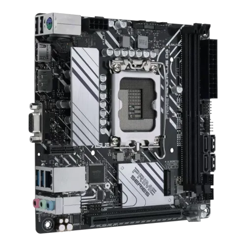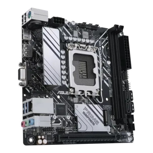 The ASUS PRIME H610I-PLUS D4 Mini ITX motherboard is engineered to deliver high performance and robust connectivity for compact PC builds. It is based on the Intel H610 chipset and supports the Intel LGA 1700 socket, making it compatible with 14th, 13th, and 12th Gen Intel Core processors. This motherboard boasts an enhanced power delivery system with 5+1+1 DrMOS power stages, ensuring stable and reliable performance. Cooling is efficiently managed through the inclusion of VRM and PCH heatsinks, as well as Fan Xpert technology. In terms of connectivity, it offers a 32Gbps M.2 slot, Realtek 1 Gb Ethernet, and multiple USB 3.2 Gen 1 ports, ensuring fast data transfer and reliable internet connectivity. The motherboard supports a variety of display outputs, including DisplayPort, HDMI, and D-Sub, providing versatile options for different setups. Additional features include COM and mono-out headers with an Amp IC for expanded peripheral connectivity and SATA 6 Gbps ports for quick data access. The ASUS PRIME H610I-PLUS D4 incorporates 5X Protection III, offering multiple hardware safeguards. This combination of performance, cooling, connectivity, and protection makes it an excellent choice for building a powerful yet compact system.