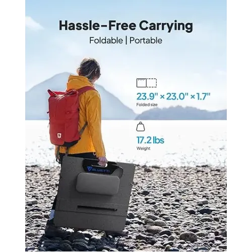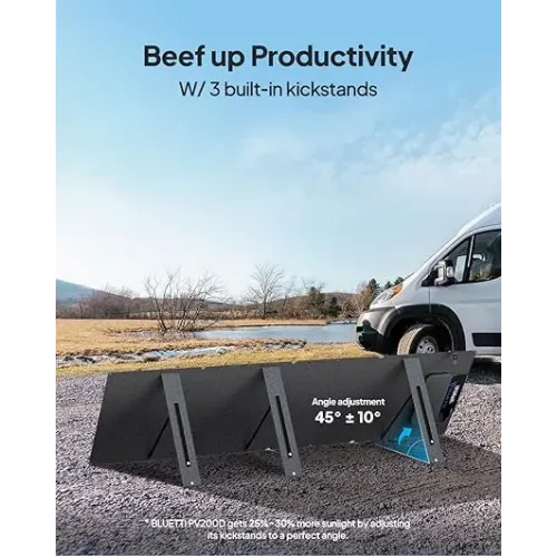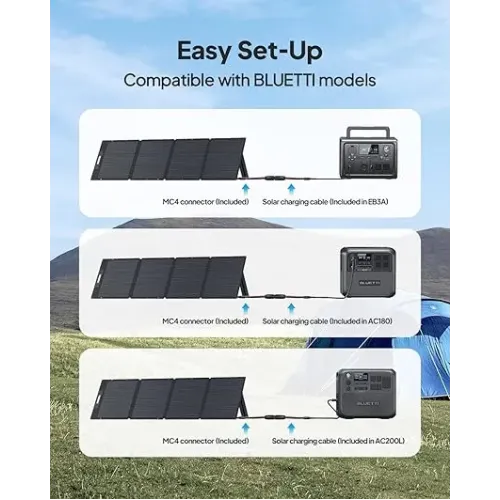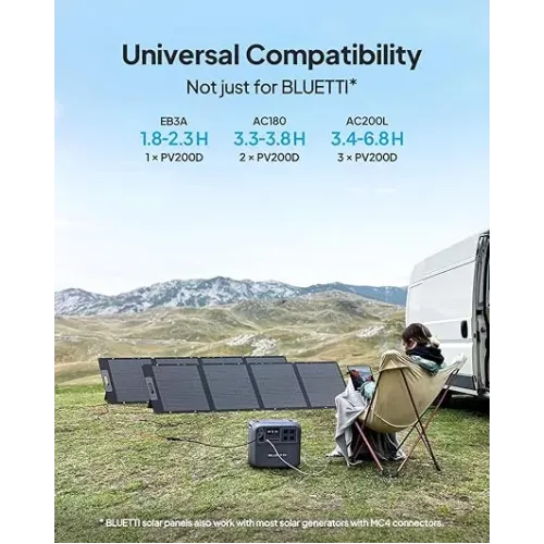 The BLUETTI PV200 Solar Panel is a high-performance, portable solar solution designed for eco-conscious adventurers and off-grid power users. Delivering a robust 200W of solar power, this panel features advanced monocrystalline silicon cells with an impressive efficiency of up to 23.4%, ensuring maximum energy conversion even in low-light conditions. Its durable ETFE lamination enhances longevity and weather resistance, making it ideal for outdoor use. With a voltage at max power (Vmp) of 20.5V and a current at max power (Imp) of 9.7A, the BLUETTI PV200 offers reliable and consistent output. The open circuit voltage (OCV) reaches 26.1V, while the short circuit current (Isc) stands at 10.3A, supporting a wide range of solar generators and battery systems. Equipped with a standard MC4 connector, it ensures seamless compatibility with most solar setups. Weighing just 16.1lbs (7.3kg), the panel folds down to a compact 21 × 18.5in or 23.2 × 24.8in, and unfolds to a generous 23.2 × 89.2in, offering portability without compromising surface area. Designed to operate in temperatures ranging from -10℃ to 65℃ (14℉ to 149℉), with optimal performance at 25℃ (77℉), it’s built for diverse climates. The 118in (3m) cable provides flexible placement options. Whether you're camping, RVing, or preparing for emergencies, the BLUETTI PV200 Solar Panel is a reliable and efficient choice for sustainable energy on the go.