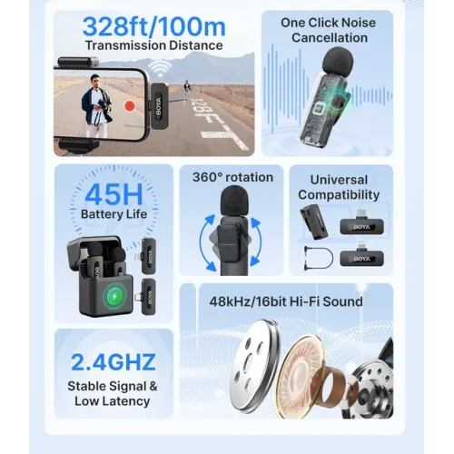 The BOYA BY-V30 Wireless Microphone is a powerful and compact solution tailored for content creators, mobile journalists, and professionals needing reliable audio on the go. This advanced BOYA BY-V30 2.4 GHz Dual-Channel Wireless Microphone system includes two ultra-light transmitters with built-in silicon microphones, ensuring crisp, professional-grade audio capture. Designed for seamless compatibility, it offers plug-and-play functionality via a USB Type-C connector, and works effortlessly with USB-C, Lightning (via adapter), and 3.5mm TRS devices. With 48 kHz/16-bit sampling, a >80 dB signal-to-noise ratio, and 120 dB SPL, the BOYA BY-V30 Dual-Channel Wireless Microphone delivers crystal-clear sound across a broad 20 Hz to 16 kHz frequency response. It also features one-click noise cancellation and low latency of just 25 ms, making it ideal for real-time recording scenarios like interviews, podcasts, and vlogging. A standout feature of the BOYA BY-V30 Microphone System is its 100-meter stable transmission range, offering maximum mobility during shoots. Each transmitter runs for up to 9 hours, while the 400 mAh charging case extends the total working time to 36 hours, ensuring uninterrupted recording sessions. The lightweight and compact case (86.5g) measures 62 × 38.5 × 79.8 mm, perfect for field work. With physical button controls, mono/stereo output options, and support for charging while recording, the BOYA BY-V30 Wireless Microphone is designed for hassle-free use with smartphones, DSLRs, and audio recorders. Combining top-tier specs and practical design, the BOYA BY-V30 Microphone System is the ideal wireless mic solution for creators who demand performance and portability.