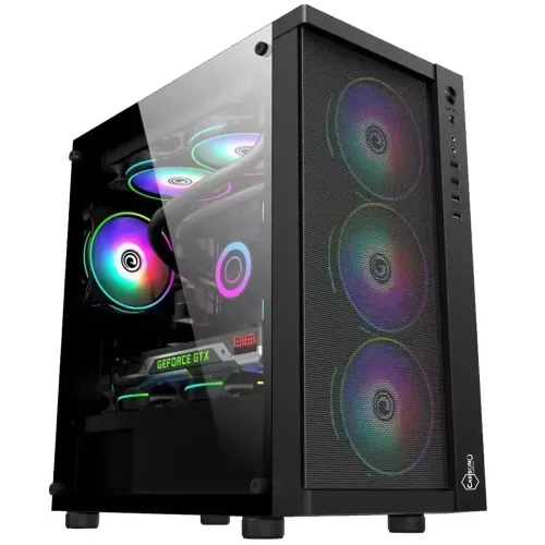 The Carbono CG02XZM M-ATX Mid Tower Gaming Casing is an excellent choice for gamers and PC builders who seek a versatile and attractive enclosure. Because this mid-tower box supports several motherboard formats, including M-ATX, and ITX, it can be used in a variety of construction configurations. Its tool-free tempered glass side panel allows for easy access and a clear view of your components, while mounting up to seven fans ensures exceptional cooling capabilities. Bright illumination and effective airflow are provided right out of the box with the four 120mm ARGB fans that are included, three at the front and one at the rear. The Carbono CG02XZM M-ATX Mid Tower Gaming Casing may accommodate additional fans at the top, bottom, and power compartment for specific cooling solutions. Radiator support offers a variety of liquid cooling options, including front mounts for 120mm, 140mm, and 240mm radiators as well as top and rear mounts for 120mm and 140mm radiators. High-performance components can be used with the Carbono CG02XZM Mid Tower Gaming Casing, which has a maximum CPU cooler height of 165mm and supports GPUs up to 350mm in length. The PSU bay ensures enough power for demanding setups by supporting power supplies up to 200mm. The front I/O panel features a microphone jack, two USB 2.0 ports, a USB 3.2 Gen1 Type-A port, and an HD audio-out for convenient communication. The internal disk bays of the case provide ample storage space, supporting three 2.5" SSDs and two 2.5"/3.5" HDDs. The sleek black style and practical features like dust filters on the front, left side, and bottom keep your system looking nice and tidy. Because it seamlessly blends appearance and functionality, the Carbono CG02XZM M-ATX Mid Tower Gaming Casing, including four expansion slots, is a fantastic choice for building a robust and striking gaming setup.
