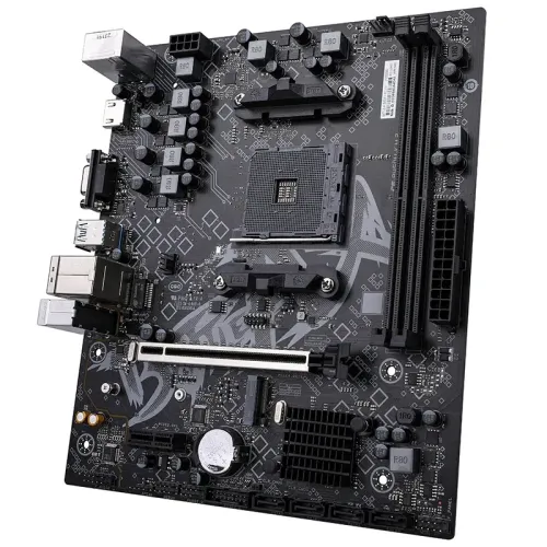 The Colorful BATTLE-AX B450M-K M.2 V14 AM4 mATX motherboard is designed for consumers who desire reliable features, broad compatibility, and strong performance in a small micro-ATX package. Supporting AMD Ryzen series processors via the AM4 socket, it provides a solid basis for gaming rigs, productivity settings, and daily computers. Memory performance is impressive, with two DDR4 sockets enabling up to 64GB total capacity, or 32GB each slot, and speeds up to DDR4-4000 (OC). The Colorful BATTLE-AX B450M-K M.2 V14 Motherboard optimizes memory settings for steady, high-performance operation thanks to its dual-channel architecture and support for Extreme Memory Profile (XMP). Storage options are equally diverse, with one M.2 slot supporting 2242/2280 SSDs via PCIe 3.0 x4 or SATA and four SATA 6Gb/s connectors for extra drives. The board's back I/O contains two USB 2.0 ports, four USB 3.2 Gen 1 Type-A connectors, HDMI 2.0 support for 4K @ 60Hz, VGA, PS/2, Gigabit LAN, and three audio jacks. The colorful BATTLE-AX B450M-K M.2 V14 Motherboard includes internal headers for expansion of more USB ports, audio, fans, and front panel connectors, as well as debug and jumper pins for expert users. Expansion slots include one PCIe 3.0 x16 slot for graphics cards and one PCIe 2.0 x1 slot for add-on cards. The motherboard includes a 128M UEFI BIOS that supports several languages, as well as advanced power management features such as S3/S4 wake-up, network S5 wake-up, USB wake-up, and scheduled boot choices. The colorful BATTLE-AX B450M-K M.2 V14 Motherboard includes monitoring tools that let you to regulate CPU and system fan speeds, as well as track CPU, system, and voltage temperatures in real time. The dependable RTL8111H Gigabit Ethernet controller handles networking, while the Realtek ALC897 codec provides high-fidelity audio up to 5.1 channels. This colorful BATTLE-AX B450M-K M.2 V14 mATX Motherboard is 230mm x 197mm and fits comfortably into tiny enclosures without sacrificing connectivity or performance.