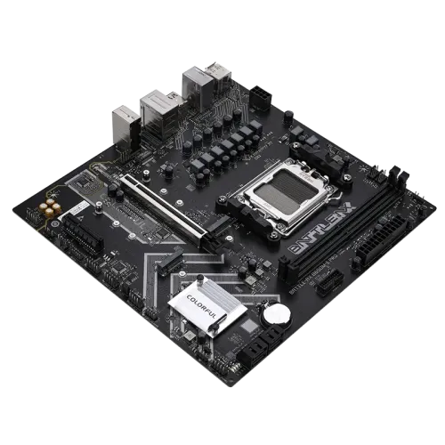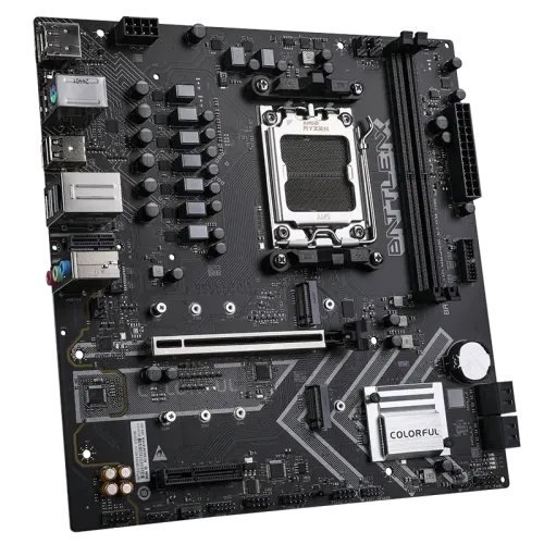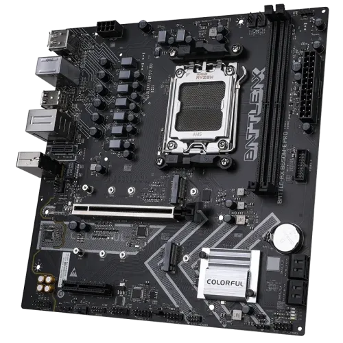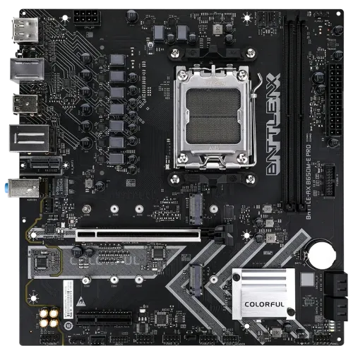The colorful BATTLE-AX B650M-E PRO V14 AM5 mATX motherboard supports AMD Ryzen 7000, 8000, and 9000 processors via the AM5 socket. It gives a solid base for gaming, productivity, and creative endeavors. Memory support is impressive, with two DDR5 slots capable of handling up to 96GB of total capacity, or 48GB each slot, and speeds up to DDR5-7600 (OC). Dual-channel design, Extreme Memory Profile (XMP), and Extended Profiles for Overclocking (EXPO) enable users to achieve consistent overclocking for faster multitasking and smoother gameplay. The colorful BATTLE-AX B650M-E PRO V14 AM5 mATX motherboard provides exceptional storage versatility, with two M.2 slots and four SATA 6Gb/s ports that enable RAID 0, RAID 1, and RAID 10 configurations. The M.2\_1 slot connects directly to the CPU via PCIe 4.0 x4, while the M.2\_2 slot runs through the chipset, providing builders with various options for SSD installations. Rear I/O connectivity includes four USB 2.0 ports, two USB 3.2 Gen 1 Type-A ports, HDMI 2.0 and DP 1.2 for 4K monitors, a PS/2 connector, Gigabit LAN, three audio jacks, and a BIOS update button. Onboard headers enhance communication even further. The colorful BATTLE-AX B650M-E PRO V14 motherboard includes USB pins, several fan headers, ARGB lighting compatibility, and diagnostic features such as a POST card pin and clear CMOS jumper. There are two expansion slots: one for graphics cards (PCIe 4.0 x16) and one for add-on cards (PCIe 4.0 x4). The board is powered by a 256M UEFI BIOS that supports multiple languages, allowing for easy configuration. Power management options include wake-on-LAN, USB wake-up, and scheduled startup. The colorful BATTLE-AX B650M-E PRO V14 AM5 mATX motherboard features monitoring of CPU and system fan speeds, temperatures, and voltages for precise management. The RTL8111K Gigabit Ethernet controller handles networking, and the Realtek ALC897 codec supports up to 5.1 channels of audio. This mATX motherboard, measuring 244mm x 235mm, strikes the right combination between performance and expandability, making the Colorful BATTLE-AX B650M-E PRO V14 motherboard an excellent choice for current PC designs.