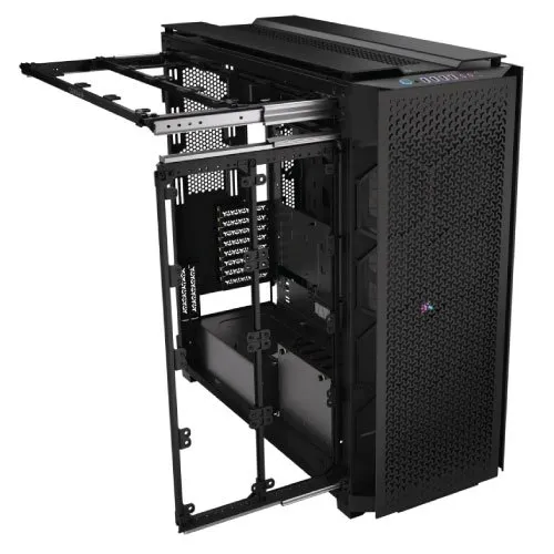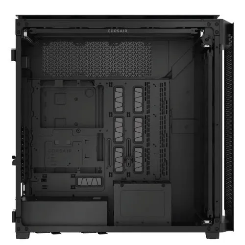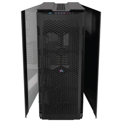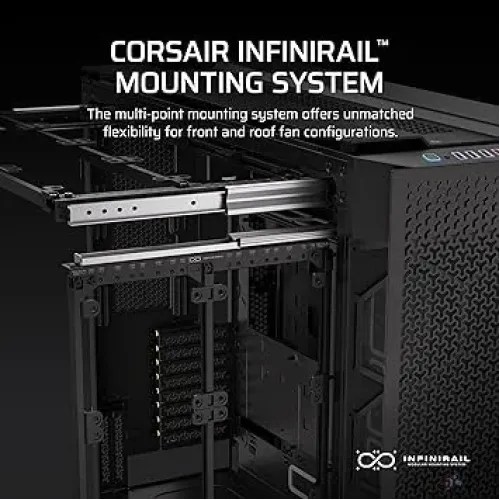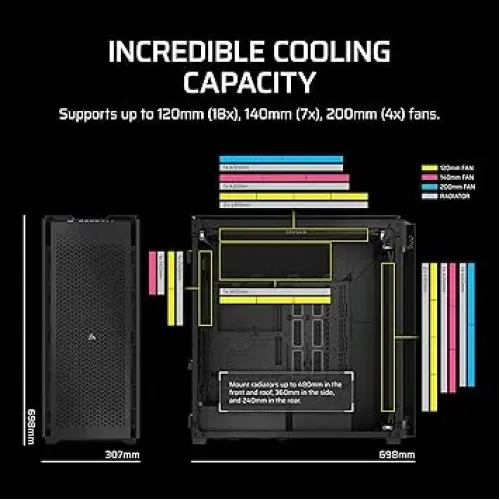 The Corsair 9000D RGB Full-Tower E-ATX Case is a super-tower PC case built for high-end performance and extreme customization. This premium chassis supports Mini-ITX, Micro-ATX, ATX, E-ATX, and SSI-EEB motherboards. It features a durable steel frame and a sleek tempered glass side panel, ideal for showcasing your components. The case comes in a professional black color, making it suitable for both gaming and workstation builds.The Corsair 9000D case provides exceptional cooling compatibility. It supports multiple radiator sizes—including 480mm, 420mm, 400mm, 360mm, 280mm, 240mm, 200mm, 140mm, and 120mm—on the top, front, side, and rear. There is no radiator support at the bottom, ensuring maximum space for other components. The case also supports up to 18 fan mounting positions, including 8x 120mm or 3x 140mm on the top and front, and 3x 120mm on the side. Rear fan support includes 2x 120mm or 1x 140mm. Bottom fan support is not included, ensuring better airflow management.This full tower offers excellent hardware clearance. It supports graphics cards up to 580mm, CPU coolers up to 180mm, and power supplies up to 225mm. For storage, it includes 5 internal 3.5" drive bays and 6 internal 2.5" bays, making it ideal for data-heavy systems or RAID configurations. The CORSAIR 9000D Full-Tower Case also offers 8 horizontal and 2 vertical expansion slots, with additional support for a secondary vertical GPU. Vertical GPU mounting is supported with an optional riser card (sold separately).The front I/O panel is rich in connectivity. It features 2x USB 3.2 Gen 2 Type-C, 4x USB 3.2 Gen 1 Type-A, and 1x audio in/out combo jack. The case also includes HD Audio, USB Type-E, SATA Power, and F_PANEL headers for clean motherboard integration. Reverse connector motherboard support makes it future-ready for the latest board designs. The cable routing space is 76mm, giving you plenty of room for clean, organized builds.The Corsair 9000D RGB is also compatible with popular liquid coolers including CORSAIR H60, H100, H115, H150, H170, NAUTILUS, and TITAN. It does not include pre-installed fans, allowing users to choose their own cooling setup. Advanced dust filtration is integrated to keep your system clean and optimized over time.If you're looking for a premium, feature-rich chassis for an enthusiast-grade build, the Corsair 9000D RGB Full-Tower E-ATX Case is a top-tier choice. With its massive space, top-class cooling support, and elegant glass design, it is perfect for gamers, creators, and system builders alike.