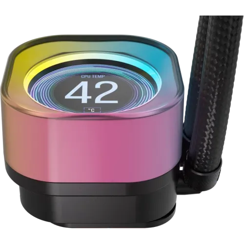 With a Customizable 2.1" IPS LCD display with 480x480 resolution and an ultra-bright 600cd/m² backlight, the Corsair iCUE Link H100i LCD RGB 240mm AIO Liquid CPU Cooler shows your team's emblem, your favorite animated GIF, or the funniest meme at 30 frames per second in over 16.7 million colors.