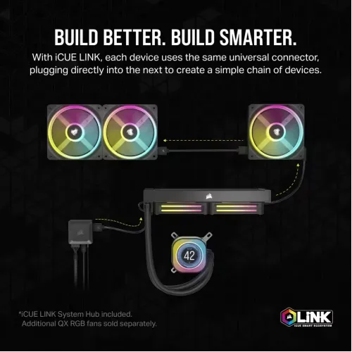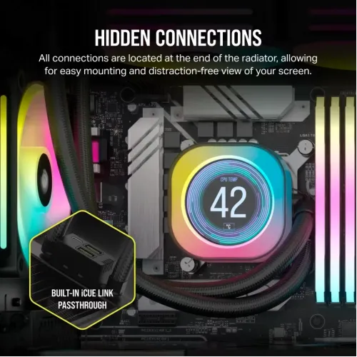 The Corsair iCUE Link System Hub, which connects up to 24 iCUE LINK devices (12 per port) in any sequence, was bundled with the Corsair iCUE Link H100i LCD RGB CPU Cooler. In iCUE, monitor CPU and coolant temperatures, regulate and synchronize RGB lights, and modify fan and pump speeds. With concealed connections to guarantee that there are no visual distractions, a stunning backdrop is created by 20 LEDs on the pump base and 24 RGB LEDs surrounding the screen.