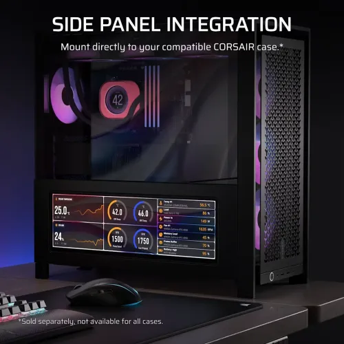 The Xeneon Edge can be used as a desktop control panel or display by attaching to the accompanying desktop stand, which is magnetically attached. With its 14 integrated magnets, the Corsair XENEON EDGE 14.5" LCD Touchscreen Display may be mounted firmly on a PSU shroud, within your case, or on a metal panel. The Xeneon Edge comes with two ¼-20" mounting points that allow it to be mounted to any conventional AV arm or an Elgato Multi-Mount.