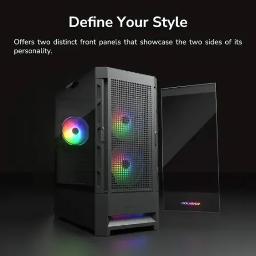 The Cougar DUOFACE RGB Case stands out with its premium design and sleek aesthetics. It features a durable 4mm tempered glass side panel that offers a clear view of your internal components, making it perfect for showcasing RGB lighting and high-end hardware. The glass panel adds a modern touch while maintaining structural integrity. Its mid tower form factor blends style with functionality, fitting easily into gaming setups or professional workstations. Whether you're highlighting custom cooling, vibrant lighting effects, or a powerful GPU, this casing turns your build into a visual centerpiece with elegance and edge.