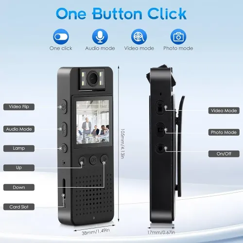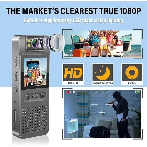 | Others | Type: Mini One-button operation for quick and easy use Supports charging while recording LED indicator for status notification Applications: Personal security Law enforcement Outdoor activities Home surveillance Build & Design: Material: High-quality ABS plastic Dimensions: Lightweight and compact for portability Mounting: Clip-on design for easy attachment to clothing or surfaces Power Supply: 5V DC via USB PC Compatibility: Windows and Mac OS Motion Detection: Advanced motion sensor for automatic recording Camera Lens: 120° wide-angle lens for a broader view Night Vision: Yes, Infrared Night Vision for low-light recording Microphone: Built-in for audio recording |