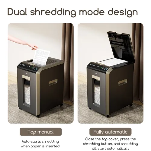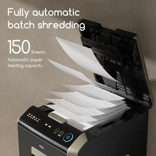 The Deli ET089 32L Auto Paper Shredder is a strong and dependable shredding device suitable for both home and business use. The Deli ET089 has great performance with dual shredding modes that can handle up to 12 pages manually and 200 sheets automatically for optimal efficiency. The Deli ET089 Paper Shredder has a high-security 4×12 mm (P4) cross-cut shred size to destroy sensitive papers completely. It also easily shreds credit cards, paper clips, and staples, adding ease and diversity to its capabilities. The Deli ET089 32L Paper Shredder, with its huge 32L waste bin, enables longer shredding without frequent pauses, with continuous operation lasting up to 60 minutes in auto mode and 30 minutes in manual mode. The Deli ET089 32L Auto Paper Shredder, with its user-friendly touch screen and elegant black appearance, is an excellent solution for protecting secrecy and efficiency in any workplace.
