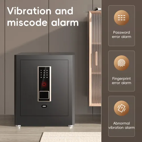 The Deli ET595 Fingerprint Password Digital Locker & Vault is designed to provide strong security for your valuable items. The Deli ET595 Fingerprint Digital Safe offers a perfect blend of robust security and modern design, tailored to protect your valuable items with confidence. Constructed from heavy-duty carbon steel and finished in sleek black, this Digital Safe Box / Locker / Vault not only delivers superior protection but also complements contemporary interiors. It supports four convenient unlock modes—password, fingerprint, a combination of both, and a mechanical key—giving users flexible and secure access options. The front panel features a digital touchscreen button interface, offering intuitive control and easy setup. For added security, the Deli ET595 digital safe locker includes an intelligent alarm system that activates if the wrong password is entered repeatedly or if the unit is subjected to vibrations, effectively deterring tampering attempts. With dimensions of H45 x W38 x D32 cm and a weight of 19.3 kg, the ET595 provides a compact yet spacious interior for storing documents, electronics, jewelry, and other personal belongings. The reinforced door is 11.5mm thick, while the body maintains a 1.5mm thickness, ensuring enhanced resistance against forced entry. Whether used at home or in the office, the Deli ET595 Digital Safe Box combines perfect access control with dependable construction to deliver peace of mind and long-lasting performance.