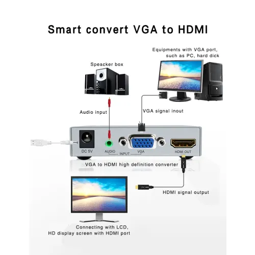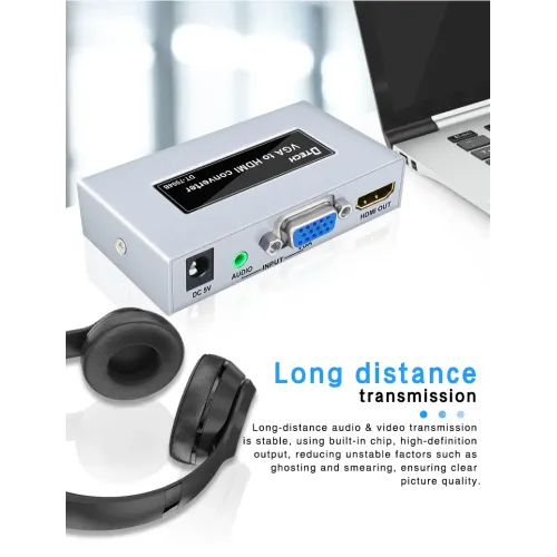 The Dtech DT-7004B VGA to HDMI Converter is a dependable solution for easily bridging the gap between analog and digital displays, making it an indispensable tool for professionals, students, and home users who want to ensure maximum compatibility with their devices. This Dtech DT-7004B VGA to HDMI Converter is designed to convert VGA analog video signals and 3.5mm stereo audio into a clear HDMI digital output, allowing older equipment such as laptops, DVRs, and projectors to effortlessly connect to current LCD TVs, HD displays, and other HDMI-enabled devices. This converter is designed to provide an easy approach to improve the visual and audio quality of older hardware without requiring complicated installations. The Dtech DT-7004B VGA to HDMI Converter's input VGA signal format supports up to 1920 x 1080P resolution while being backward compatible with lower resolutions, providing versatility for a wide range of devices. Its HDMI output retains vivid 1080P clarity at both 50Hz and 60Hz, providing smooth images and consistent performance for work presentations, education, and enjoyment. The Dtech DT-7004B VGA to HDMI Converter features perfect impedance matching at 100Ω, ensuring reliable video signal conversion without distortion or lag. This converter is designed to operate in situations with temperatures ranging from -25°C to 75°C and humidity tolerances of up to 65%, ensuring stability and dependability even under extreme conditions.