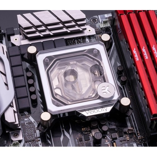 The new EKWBEK-Quantum Velocity Nickel Plexi comes with the new high-performance flagship premium quality CPU water block for modern Intel processors. It features a fresh design that will enable a vast number of variations and options for enthusiasts. This latest EK Quantum Velocity series CPU water blocks embed the 5th generation of the award-winning EK CPU water block cooling engine and also further tweaked for performance and optimal coolant flow, Low hydraulic flow restriction enables this product to be used in setups using weaker water pumps or lower pump speeds for added silent operation.