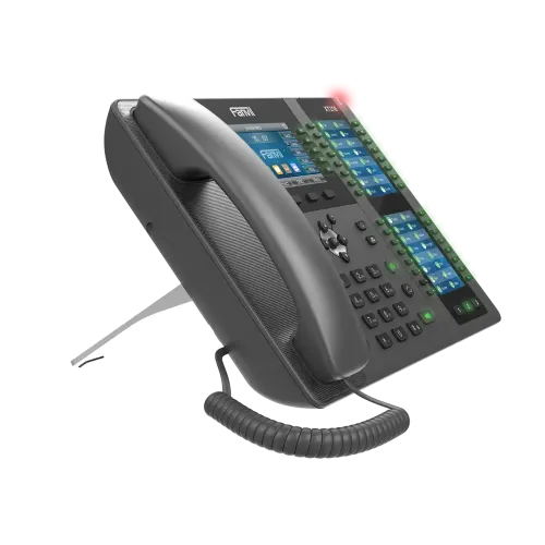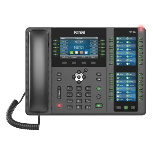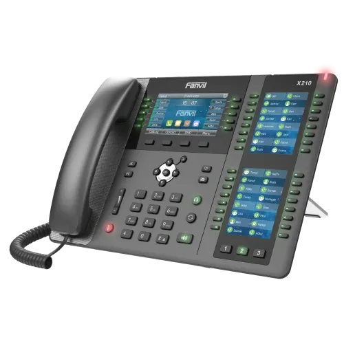The Fanvil X210 is a high-end enterprise IP phone designed for users handling medium to high call volumes in their daily work. Equipped with advanced features, it provides flexible and efficient communication solutions. The IP phone features a 4.3" main color display with 10 DSS keys, along with two 3.5" side color displays, allowing up to 96 DSS keys (32 physical) for BLF, speed dial, and group broadcasting functions. In total, it offers up to 106 DSS keys to streamline call management. The Fanvil X210 high-end Enterprise PoE IP Phone boasts HD audio quality, ensuring crystal-clear voice communication. It comes with built-in Bluetooth and Wi-Fi connectivity for seamless wireless communication. Enhanced compatibility is provided through EHS support, dual Gigabit ports, and Power over Ethernet (PoE) capability.