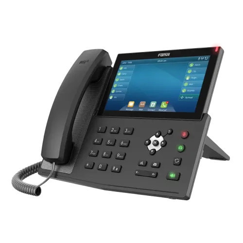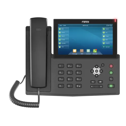 The Fanvil X7 Enterprise IP Phone is a high-end solution to meet the needs of business users requiring quick access to critical information. It features a large 7-inch capacitive touch screen that allows effortless navigation and offers space for up to 127 DSS (Direct Station Selection) key entries, enhancing productivity and convenience. With support for 20 SIP lines, HD audio utilizing Opus codec, built-in Bluetooth, and Wi-Fi connectivity, this IP phone delivers crystal-clear voice communication. The inclusion of a SIP hotspot, Gigabit Ethernet port, and PoE (Power over Ethernet) further ensures seamless and reliable connectivity. The Fanvil X7 also boasts EHS (Electronic Hook Switch) headset support, enabling hands-free communication. It extends to the ability to link with video door phones and IP cameras, making it a comprehensive and powerful communication tool for enterprises of all sizes.