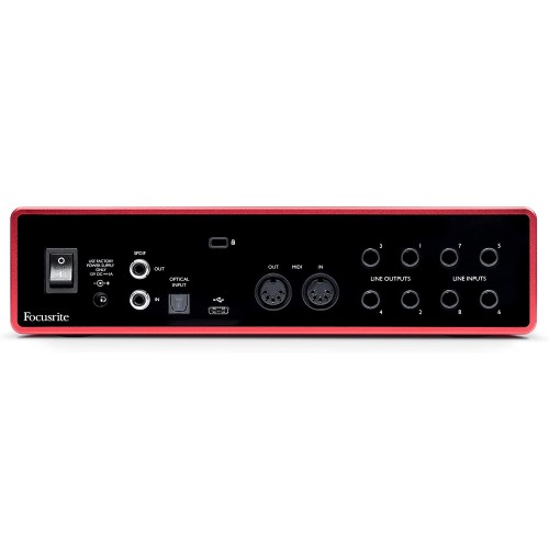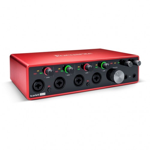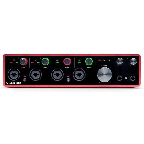 Focusrite Scarlett 18i8 3rd Gen USB Audio Interface gives you all the tools to record all your instruments in studio quality, anywhere. With its high channel count, compact size, and a huge selection of software in the box, Focusrite Scarlett 18i8 Audio Interface is ready to record your band wherever you are. It has four of the best performing Scarlett mic preamps the range has ever heard, now with Air, for making up guitars or recording vocals. It comes with two high headroom instrument inputs, for plugging your guitar or bass straight in. It features eight balanced line inputs, for connecting synths or other line-level audio, and four balanced outputs, for monitoring and effects sends. It has four monitor outs, featuring anti-thump tech and speaker switching. It has no warranty.