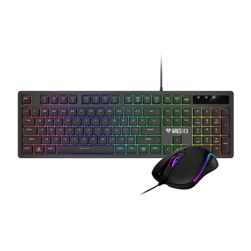 The Gamdias ARES E3 keyboard delivers a visually stunning experience with its vibrant multi-color backlighting and durable low-profile membrane switches. Perfectly paired with a 3600 DPI ergonomic gaming mouse, this setup is thoughtfully designed to meet the demands of gamers, offering precision, comfort, and a competitive advantage in every battle.