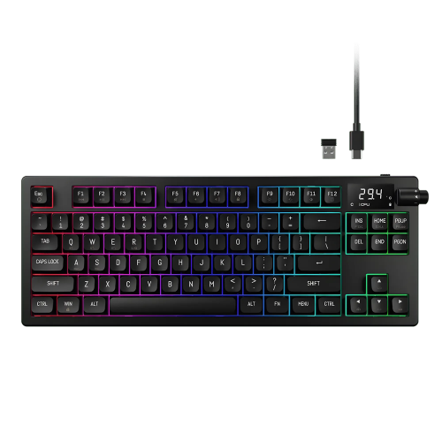The Gamdias HERMES M7 HYBRID RGB Red Switch Gaming Mechanical Keyboard features GAMDIAS-certified mechanical red switches that can withstand 50 million keystrokes. The Gamdias Mechanical Keyboard provides smooth, linear keystrokes ideal for fast-paced gaming. Its 5-layer gasket structure improves keystroke stability and typing sensation, and the hot-swappable design enables for simple switch replacement without soldering. The Gamdias HERMES M7 HYBRID RGB Mechanical Keyboard has three connection modes: lag-free cable, 2.4 GHz wireless, and Bluetooth, for easy switching based on your demands. The wireless features are powered by a 4000mAh battery, which provides versatility and long-lasting performance. It also has a 64KB memory for on-the-fly setting retention and a volume knob for easy audio adjustments. The Gamdias HERMES M7 HYBRID RGB Red Switch Gaming Mechanical Keyboard is designed for maximum responsiveness, with a polling rate of 1000 Hz when wired, 500 Hz on 2.4 GHz, and 125 Hz in Bluetooth mode. Anti-ghosting and N-key rollover ensure that every keystroke is reliably captured, even during the most intense gaming sessions. The Gamdias HERMES M7 HYBRID Tri-mode Mechanical Keyboard has excellent PBT keycaps for durability and resistance to wear over time. RGB backlighting improves the aesthetics of the keyboard, and while there are no adjustable lighting effects directly on the keyboard, ZEUS CAST software fully supports complex settings. Gamers will benefit from the Gamdias HERMES M7 HYBRID Mechanical Keyboard's built-in digital monitor, which displays real-time CPU and GPU temperatures, allowing them to monitor system performance without leaving the game.