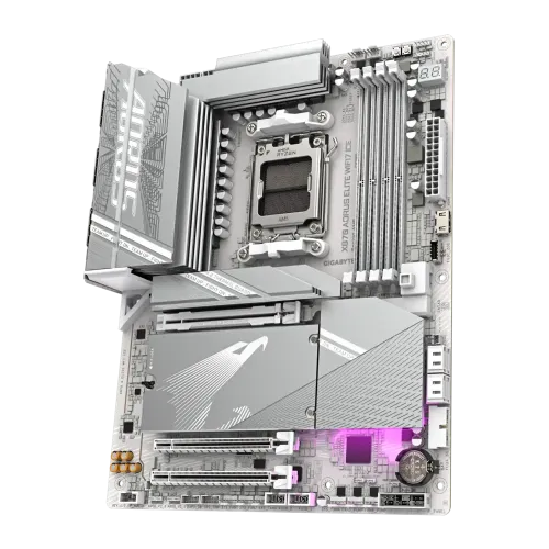 The GIGABYTE X870 AORUS ELITE WIFI7 ICE DDR5 AMD AM5 ATX Motherboard is a high-performance motherboard designed to support AMD Ryzen 9000, 8000, and 7000 Series processors, leveraging the power of the AMD Socket AM5 and advanced DDR5 memory technology. With four DIMM slots supporting dual-channel DDR5 memory and AMD EXPO Memory Module Support, it offers overclocking capabilities up to 8600MT/s, ensuring top-tier performance and compatibility. The motherboard features a robust digital twin 16+2+2 phases VRM solution, providing consistent and high-powered performance, ideal for overclocking and demanding applications. Efficient cooling solutions, such as the DDR Wind Blade for active cooling of memory modules and VRM Thermal Armor Advanced with I/O ZONE, keep your system cool under pressure. It also offers ultra-fast storage options with four M.2 slots, including three PCIe 5.0 x4 slots, for quick data access and transfer. Enhanced connectivity features such as 2.5GbE LAN, Wi-Fi 7, dual USB4 Type-C with DP-Alt, and HDMI provide versatile and high-speed networking options. The user-friendly design includes M.2 EZ-Match magnetic alignment, EZ-Latch Plus for PCIe and M.2 slots, and a friendly UI with multi-theme support, making installation and management a breeze. Additionally, the motherboard delivers superior audio quality with Realtek ALC1220 HD Audio and WIMA audiophile-grade capacitors, ensuring an immersive audio experience. Overall, the GIGABYTE X870 AORUS ELITE WIFI7 ICE DDR5 AMD AM5 ATX Motherboard is the ultimate choice for those seeking to unleash the full potential of their system with advanced memory support, robust power delivery, efficient cooling solutions, and extensive connectivity options