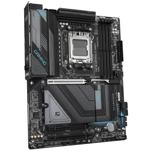 The GIGABYTE X870 GAMING X WIFI7 DDR5 AMD AM5 ATX Motherboard is a high-performance motherboard designed to support AMD Ryzen™ 9000, 8000, and 7000 Series processors, leveraging the power of the AMD Socket AM5 and advanced DDR5 memory technology. With four DIMM slots supporting dual-channel DDR5 memory and AMD EXPO Memory Module Support, it offers overclocking capabilities up to 8600MT/s, ensuring top-tier performance and compatibility. The motherboard features a robust digital twin 16+2+2 phases VRM solution, providing consistent and high-powered performance, ideal for overclocking and demanding applications. Efficient cooling solutions, such as the DDR Wind Blade for active cooling of memory modules and VRM Thermal Armor Advanced with I/O ZONE, keep your system cool under pressure. It also offers ultra-fast storage options with four M.2 slots, including three PCIe 5.0 x4 slots, for quick data access and transfer. Enhanced connectivity features such as 2.5GbE LAN, Wi-Fi 7, dual USB4 Type-C with DP-Alt, and HDMI provide versatile and high-speed networking options. The user-friendly design includes M.2 EZ-Match magnetic alignment, EZ-Latch Plus for PCIe and M.2 slots, and a friendly UI with multi-theme support, making installation and management a breeze. Additionally, the motherboard delivers superior audio quality with Realtek ALC1220 HD Audio and WIMA audiophile-grade capacitors, ensuring an immersive audio experience. Overall, the GIGABYTE X870 GAMING X WIFI7 DDR5 AMD AM5 ATX Motherboard is the ultimate choice for those seeking to unleash the full potential of their system with advanced memory support, robust power delivery, efficient cooling solutions, and extensive connectivity options