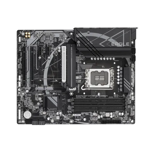 The GIGABYTE Z790 EAGLE DDR5 ATX Motherboard stands out as a top-tier choice for both gaming enthusiasts and professionals, offering unmatched performance and versatility. It is designed to support Intel Core processors from the 14th, 13th, and 12th generations, ensuring compatibility with the latest CPU advancements and providing a future-proof platform. This motherboard's power delivery system is exceptional, featuring a Twin 12+1+1 phases digital VRM solution that guarantees stable and efficient power for demanding workloads and overclocking scenarios. This is critical for maintaining peak performance and ensuring the longevity of your components. The Z790 EAGLE supports dual-channel DDR5 with up to four DIMM slots and XMP 3.0 memory module support. This allows for high-speed memory configurations, enhancing system responsiveness and multitasking capabilities. The motherboard's storage options are equally impressive, with three PCIe 4.0 x4 M.2 connectors that offer ultra-fast data access and reduced load times. These connectors are ideal for NVMe SSDs, enabling quicker boot times and faster application launches. Thermal management is a crucial aspect of any high-performance system, and the GIGABYTE Z790 EAGLE excels in this area with its advanced thermal design. It features a comprehensive cooling solution that ensures VRM power stability and optimal M.2 SSD performance. The inclusion of an M.2 thermal guard helps maintain ideal operating temperatures for high-performance SSDs, thereby prolonging their lifespan and ensuring consistent performance. The motherboard's user-friendly features include the EZ-Latch PCIe 5.0x16 slot, which simplifies the installation or removal of graphics cards. This quick-release design reduces the risk of damage during upgrades, making the process more convenient. Networking capabilities are enhanced with a 2.5GbE LAN port, which provides high-speed, stable network connectivity, crucial for gaming, streaming, and data transfers. This ensures low latency and high bandwidth for demanding applications. Connectivity is a highlight of the Z790 EAGLE, offering a variety of ports including DisplayPort and HDMI for multi-monitor setups, and a rear USB-C port supporting 10Gb/s data transfer speeds. This wide array of connectivity options accommodates numerous peripherals and external devices, making it a versatile choice for various setups. The Smart Fan 6 feature provides advanced cooling management with multiple temperature sensors and hybrid fan headers that support FAN STOP. This allows for precise control over system cooling and noise levels, maintaining optimal temperatures and ensuring quiet operation. The Q-Flash Plus feature allows for BIOS updates without the need to install the CPU, memory, or graphics card, providing a convenient solution for maintaining system firmware. This is particularly useful for ensuring compatibility with new hardware and enhancing system stability. The GIGABYTE Z790 EAGLE DDR5 ATX Motherboard is a comprehensive and powerful platform that combines state-of-the-art technology with user-friendly features, making it an excellent choice for building a high-performance PC tailored to your needs. Whether you are a gamer, a content creator, or a professional, this motherboard provides the stability, speed, and connectivity necessary for today's demanding applications.