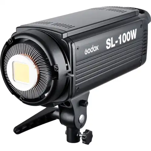 This Godox SL-100 LED Light is a versatile constant light source well-suited for video work. It is a daylight-balanced, 5600K light with a COB (chip on board) LED for great brightness and color accuracy. The light's simple design includes a rear LCD monitor and a dial for dimming from 10% to 100%. A heatsink and built-in fan are also included to help manage temperature, as well as a specialized temperature control function to safeguard the LED itself, to help assure consistent and ongoing use. The light is also designed to accept Bowens S-mount light modifiers and accessories, such as the supplied reflector, and the LED is protected by a clear cover. The color temperature of daylight-balanced light is 5600K.The 100W COB LED has a high output, color-accurate rendering, and dimming control from 10% to 100%. The rear dial and LCD can be used to change the on-board brightness. The Bowens S-mount is compatible with a wide range of light modifiers and accessories including the supplied reflector, to produce a broad, even, and neutral light quality. The integrated heatsink, built-in fan, and temperature control function assist keep the light cool while in use, ensuring safe and consistent operation. The temperature of the fixture itself can also be displayed on the rear LCD in Fahrenheit or Celsius. The Godox SL-100 Uses 100-240 VAC power and can be used anywhere in the world.