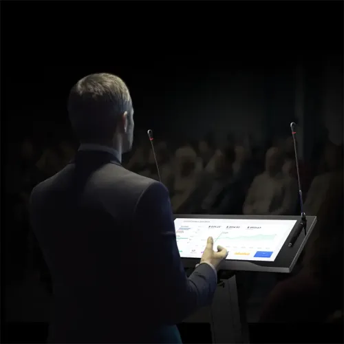 The Horion 27EP1-S Smart Lectern is an exclusive interactive display solution designed for classrooms, corporate meeting rooms, and professional presentations. The Horion 27EP1-S features a 27-inch capacitive touch screen with 4K UHD resolution (3840x2160), delivering vibrant visuals with 1.07 billion colors (10-bit), 350–400 nits brightness, a 1000:1 contrast ratio, and a 178° viewing angle, ensuring clear visibility from any position. With a pixel pitch of 0.1554×0.1554 mm and 14ms response time, the Horion 27EP1-S Smart Lectern provides smooth, responsive interaction, complemented by an E-LED backlight rated for 30,000 hours of use. The display area of 476.064(H) × 267.786(V) mm and a 76% NTSC color gamut ensure precise and immersive color reproduction for presentations. Powered by an ARM octa-core processor (A764 + A554) with 8GB RAM and 64GB storage, the Horion 27EP1-S Smart Conference System handles multitasking efficiently. Its 20-point multi-touch functionality enables multiple users to interact simultaneously, ideal for collaborative sessions. Connectivity options include HDMI IN/OUT, USB 3.0 ports, Type-C IN/OUT, LAN (RJ45), Wi-Fi, and Bluetooth, supporting wireless screen mirroring and seamless integration with external devices. The Horion 27EP1-S Smart Lectern has dimensions of 757×900×1130 mm and operates on 20V, 5A power, consuming 85W with standby power under 0.5W, making it energy-efficient. Its intelligent software features include an intelligent whiteboard, sharp handwriting recognition, synchronized audio-visual transitions, plug-and-play functionality, and an all-around assistant for multi-scene applications. The Horion 27EP1-S Smart Conference System combines advanced hardware, precise touch capabilities, and interactive features, making it the perfect choice for education, professional presentations, and modern corporate environments.