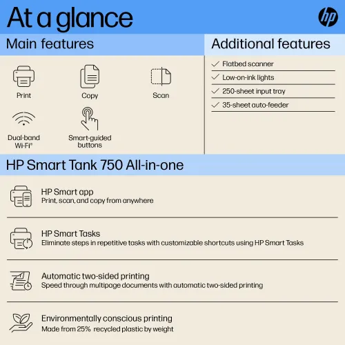 This HP Smart Tank 750 All-in-One Printer is not only efficient but also eco-conscious. It's made with 25% post-consumer recycled plastic and is recyclable through HP Planet Partners, reducing your carbon footprint.