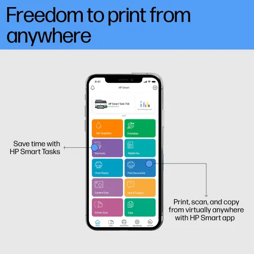 The HP Smart App empowers you to print, scan, and copy directly from your mobile phone, no matter where you are. Enjoy advanced scanning capabilities for a whole year with your HP Smart Tank 750 All-in-One Printer.