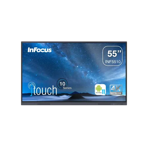 The InFocus INF5510 55" 4K Interactive Touch Display with an integrated Android 11 operating system is the ideal choice for educational and commercial applications, offering an unrivaled price-performance ratio and cost of ownership. We mix cutting-edge hardware and software with the Android 11 operating system and Amlogic's T982 system-on-chip CPU to deliver minor but significant performance improvements throughout the entire JTouch 10 Series family. The INF5510's native 4K (3840 x 2160 - 8.3MP) resolution high-performance commercial-grade screen's anti-glare coating and toughened scratch-resistant surface substantially decrease ambient reflection in high-brightness conditions without affecting image sharpness and clarity. With up to 40-point touch, twin touch pens that allow users to annotate effortlessly, a linked cloud drive, and a split-screen for apps, the JTouch 10 Series takes use of the total performance possibilities. The hidden snap-in wifi module lets you share, stream, and even modify the material from any device right on the screen. Convert your team meetings or courses into a simple, quick, and seamless interactive experience. Elegant slim matt two-tone bezels, a hidden wireless module, magnetic pen holders, and stereo front-facing 10-watt speakers combine to create a well-rounded device for educational and business settings.