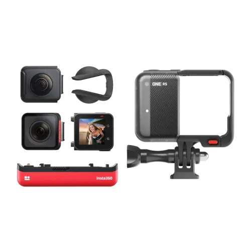 The Insta360 ONE RS Twin Edition Action Camera comes with the Core module, the 4K Boost Mod, and the 360 Mod. The necessary Battery Base to hold the modules together. When paired with the 4K Boost Lens, the Insta360 ONE RS can record 4K 60 wide-angle action footage in addition to 48MP still photos. When using the 360 Lens, the Insta360 action camera can record 5.7K 360° video with artistic effects like 360° reframing and an invisible selfie stick. Horizon Lock and FlowState stabilization are features shared by both lenses. This Insta360 action camera comes with a touchscreen live-view display and controls which are part of the Core module. When utilizing the 4K Boost Mod, the live-view screen can be set to face either forward or backward in this 360° action camera.