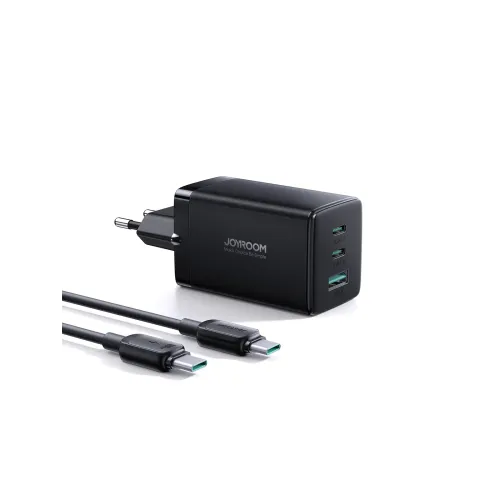 The Joyroom JR-TCG01 GaN Ultra 3 in 1 65W Fast Charger with 100W Type-C Cable is a cutting-edge charging solution designed to meet all your power needs efficiently and safely. Featuring advanced GaN technology, this charger delivers up to 65W of power, ensuring rapid and efficient charging for a wide range of devices, including laptops, tablets, and smartphones. It comes equipped with dual USB-C ports and a single USB-A port, allowing you to charge three devices simultaneously without compromising on speed. The included 100W Type-C cable further enhances its versatility, making it perfect for high-power devices. Compact and portable, the Joyroom JR-TCG01 is designed with a foldable plug, making it easy to carry and store. Its robust construction with fireproof materials ensures durability and safety, while the support for multiple fast charging protocols like PD3.0, PPS, QC3.0, Samsung AFC, and Huawei FCP/SCP guarantees compatibility with a variety of devices. Whether you're at home, in the office, or on the go, the Joyroom JR-TCG01 GaN Ultra 3 in 1 65W Fast Charger with 100W Type-C Cable provides a reliable, high-speed charging solution that keeps all your devices powered up and ready to use.