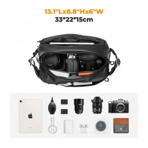 The K&F Concept KF13.157V1 Multifunctional Waterproof Camera Side Bag is a versatile 10L black camera bag designed to keep your gear protected while providing multiple carrying options. With a spacious interior capable of holding a camera and two lenses, this bag can be worn over the shoulder, around the waist, or across the body, adapting to your comfort and preference. Its waterproof, scratch- and wear-resistant fabric ensures that your equipment remains safe from moisture and minor impacts. The bag offers a size of 33x22x15cm (13.1"*8.8"*6") and a capacity of 10L, making it perfect for photographers on the go. It can be used as a shoulder bag, crossbody bag, waist bag, chest bag, or handbag, adding versatility to its already impressive design. The K&F Concept Alpha Camera Sling Bag is made from waterproof, scratch-resistant, and wear-resistant fabric, utilizing 10mm high-density EPE shockproof cotton to safeguard your valuable photography equipment. The flexible compartments inside the bag allow for optimal organization of your camera, lenses, and accessories, and the removable partition lets you customize the interior space as needed, making it suitable for both professional and everyday use. The bag also features a security-oriented design, with a double zipper system equipped with interlocking pull rings for anti-theft protection, providing an extra layer of safety for your gear. The dual zippers also offer quick and convenient access, making it easier to capture special moments whenever they arise. The K&F Concept Alpha Camera Sling Bag includes three layers of compartments, allowing you to separate your cameras, accessories, and personal items. This well-organized layout ensures that all your belongings are kept clean, accessible, and easy to find. Moreover, the bag is designed with comfort in mind. Its shoulder straps are adjustable up to 130cm (51"), making them longer and wider than those of most camera sling bags on the market, accommodating a wide range of body shapes. The magnetic safety buckle can hold up to 60kg (132lbs), while the adjustable sternum strap keeps the bag snugly against your body, reducing movement during long hikes and making it easier to carry your gear for extended periods without discomfort.