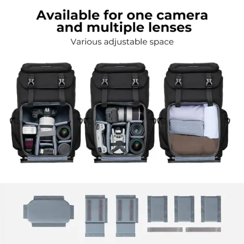 The K&F Concept KF13.098V2 Multifunctional Waterproof Camera Backpack is the ultimate solution for photographers and outdoor enthusiasts seeking a versatile and durable storage option. This thoughtfully designed backpack features a large capacity with both upper and lower compartments. The upper compartment is ideal for personal belongings, while the lower compartment includes customizable dividers for optimal gear protection. It comfortably accommodates a DSLR camera with an attached lens, three spare lenses, a flash, and various accessories, ensuring you have everything you need for your shoot. The backpack provides easy top access to a dedicated compartment that can hold a laptop up to 15.6 inches, making it convenient for editing on the go. For those who require a tripod, the backpack is equipped with attachment straps under the bag, allowing for easy storage and access. Its transformable design enables you to convert the backpack into a trendy day bag by removing all dividers, creating one large compartment for everyday use. Comfort is paramount with the K&F Concept backpack, as it features well-padded, adjustable shoulder straps and a chest strap for extended wear. There are also zippered side pouches for water bottles, ensuring you stay hydrated while on the move. Constructed from the latest Grade 5 waterproof 1000D Kenila Nylon, this camera bag is built to withstand various weather conditions and provide excellent protection for your gear. With a size of 30 cm x 25 cm x 46 cm, a capacity of 25 liters, and a weight of just 1.4 kg, the K&F Concept KF13.098V2 is the perfect companion for all your photography adventures.