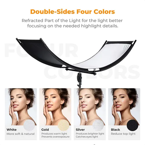 The K&F Concept KF18.0012 4-in-1 Curved Reflector Panel is a professional lighting tool designed for photographers and videographers seeking versatile and precise light control. This K&F Concept KF18.0012 Curved Reflector Panel features four interchangeable reflective surfaces—Silver, Gold, White, and Black—allowing users to create a variety of lighting effects, from bright highlights and warm tones to soft fills or light blocking. Its unique U-shape curved design enables natural and controlled light wrapping, making it perfect for portraits, fashion, product photography, and videography. The foldable and lightweight frame of the K&F Concept KF18.0012 Reflector Panel ensures easy setup, storage, and portability. Integrated stand mounts provide hands-free use with compatible light stands, while it can also be handheld for flexible lighting adjustments. The durable carrying bag included makes the reflector panel convenient for on-the-go shoots, making the K&F Concept KF18.0012 4-in-1 Curved Reflector Panel an essential accessory for achieving professional lighting results anywhere.