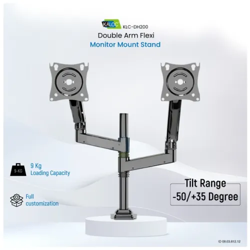 The Kaloc KLC-DH200 is a premium, adjustable double-arm desktop mount designed to elevate and optimize your workspace by providing versatile positioning for your monitors. This sturdy and sleek stand, constructed from high-quality aluminum alloy, offers both durability and a modern aesthetic. It supports a wide range of screen sizes, from 17 to 35 inches, making it adaptable for various monitor types and brands. With a robust loading capacity of up to 9 kg (approximately 19.8 lbs) per arm, the KLC-DH200 ensures that your monitors are securely held in place without any risk of sagging or slipping. The mount is compatible with VESA mounting patterns of 75 x 75 mm and 100 x 100 mm, providing flexibility for different monitor brands and models. Its extensive adjustability allows you to find the perfect monitor positioning for your needs, with a tilt range of -50 to +35 degrees for substantial vertical adjustment, and a height adjustment range from 503 to 575 mm. This level of customization ensures that you can set your monitors to the ideal eye level, promoting better posture and ergonomic comfort, which helps reduce eye strain and neck pain associated with prolonged computer use. The Kaloc KLC-DH200 is the ability to enhance ergonomics by allowing adjustments to the height, tilt, and position of your monitors, thereby promoting a healthier and more comfortable working posture. Its dual-arm design helps free up valuable desk space, creating a cleaner and more organized workspace, and maximizing usable area for other tasks and equipment. This flexibility in monitor positioning can significantly boost productivity by facilitating multitasking and making it easier to manage different applications simultaneously. The aluminum alloy construction not only ensures durability but also adds an elegant touch to your workspace, complementing various office decors and enhancing the overall aesthetic appeal. The Kaloc KLC-DH200 is easy to install, thanks to the provided mounting gear and clear instructions. Periodically checking that all screws are tight and joints are operating smoothly is part of maintenance; cleaning is as easy as using a moist cloth. For those looking for a dependable and adaptable monitor Arm that combines flexibility, durability, and aesthetic appeal, the Kaloc KLC-DH200 is a great option overall. Whether in a home office or a corporate setting, it is a valuable purchase for anybody wishing to improve the ergonomics and productivity of their workflow.