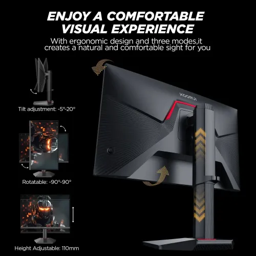 The KOORUI G2511E 320Hz FHD Gaming Monitor features a 24.5-inch flat IPS display that produces brilliant colors with 99% sRGB, 95% DCI-P3, and 72% NTSC coverage, making every scene look rich and detailed. The KOORUI G2511E 24.5" 320Hz Gaming Monitor also has a robust 320Hz refresh rate and a quick 1ms GTG response time, which gives competitive players a significant advantage by decreasing motion blur and increasing reaction accuracy during fast-paced competition. The KOORUI G2511E Gaming Monitor boasts a Full HD resolution of 1920×1080 and a brightness level of 350 cd/m², ensuring great visibility in bright surroundings. Its 178-degree broad viewing angle offers consistent colors from all angles, and LED backlighting improves total picture uniformity. This KOORUI G2511E Monitor supports FreeSync, G-Sync, Adaptive Sync, and OD acceleration, ensuring tear-free and smooth performance in a variety of gaming scenarios. HDR 400 support increases contrast and improves both dark and bright scenes, allowing players to experience more dramatic visuals. The KOORUI G2511E Gaming Monitor also has an innovative stand with height adjustment of up to 110mm, tilt from -5° to 20°, and rotation from -90° to 90°, allowing players to choose the most comfortable gaming position. The KOORUI Monitor's 75×75mm VESA mount and M4×8mm screws make it compatible with wall mounts and arm installations, allowing for a versatile desk layout. Gamers will appreciate how the KOORUI G2511E 24.5" 320Hz 1ms FHD IPS Gaming Monitor combines speed, color accuracy, and comfort to improve competitive play.