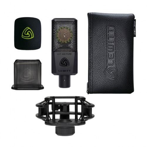The Lewitt LCT 440 PURE is a 1" true condenser studio microphone that offers a rewarding studio-class sound on anything from vocals and acoustic instruments to drums and guitar cabs. It features a gold-sputtered 1" large-diaphragm capsule and high-end circuitry, so it can produce polished sonics and handle punishing SPLs before distorting. Supplied with a shock mount, foam windscreen, and pop filter, the LCT 440 PURE is a capable mic package for the studio or stage. The LCT 440 PURE requires 48V phantom power and can be connected to an XLR input on your mixer, audio interface, or mic preamp. The Lewitt LCT 440 PURE comes with no warranty.