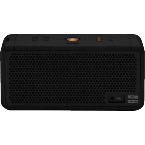 The Marshall Middleton Portable Bluetooth Speaker is a high-performance audio device housed in a small and robust design. This speaker provides up to 20 hours of playback on a single charge, ensuring continuous music enjoyment wherever you go. With 60W of total audio power, it produces immersive sound with deep bass and sharp highs owing to its twin 3" 15W woofers, dual 3/5" 10W tweeters, and two passive radiators. Built to endure the weather, its dust and water-resistant design is ideal for outdoor trips. For those who want even more sound, the speaker may be combined with numerous units in stack mode to provide an enhanced experience. Convenient top-mounted analog controls allow for quick adjustment of volume and playback. Whether you're at a backyard barbecue, camping in the wilderness, or hosting a party, the Marshall Middleton Portable Bluetooth Speaker delivers powerful, high-quality audio that sets the stage for unforgettable moments.