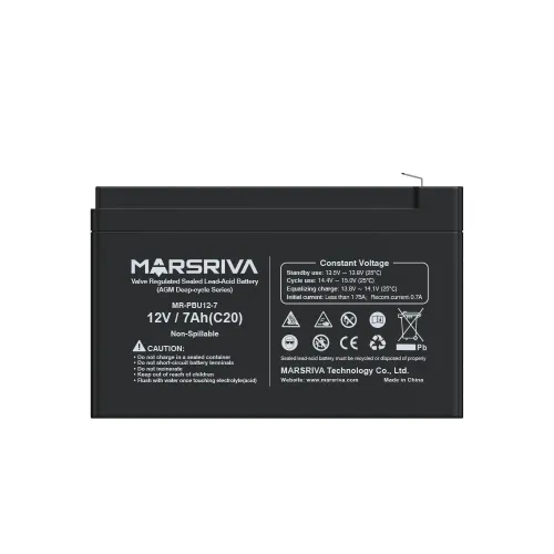 The Marsriva MR-PBU12-7 12V 7Ah Sealed Lead-acid Battery is a premium-quality, maintenance-free AGM (Absorbent Glass Mat) battery designed to deliver long-lasting and dependable backup power for a wide range of applications. Featuring a nominal voltage of 12V and a capacity of 7.0Ah, this high-performance battery is ideal for use in UPS systems, emergency lighting, alarm and security systems, medical devices, and solar-powered equipment. The Marsriva MR-PBU12-7 12V 7Ah Battery is engineered with precision sealing technology and a valve-regulated design, ensuring leak-proof operation and maximum safety even under demanding conditions. Built with a Pb-Ca multi-alloy grid, it offers high corrosion resistance, longer service life, and better conductivity. Its maximum discharge current of 105A for 5 seconds allows it to handle high-energy demands with ease, making it suitable for instant power surge requirements. The battery has an internal resistance of approximately 42.0mΩ, contributing to efficient power output and minimal energy loss. With a low self-discharge rate of only 3% per month at 25℃, the Marsriva MR-PBU12-7 12V 7Ah UPS Battery retains charge over extended periods of storage. It supports float charging voltages between 13.5V to 13.8V and cycle use voltages ranging from 14.4V to 15V at 25℃, ensuring optimal charging performance in both standby and cyclic applications. The Marsriva MR-PBU12-7 12V Battery is housed in a durable ABS casing that is both heat and impact-resistant, and it weighs just 2.0kg, making it easy to install and maintain. Equipped with F1/F2 terminal options, this battery ensures flexible connectivity for various systems. Thanks to its high energy density, powerful discharge capability, excellent charge acceptance, and deep cycle performance, the Marsriva MR-PBU12-7 12V 7Ah Sealed Lead-acid Battery stands out as a top-tier solution for anyone needing reliable backup power with consistent performance and long service life.