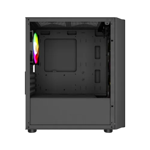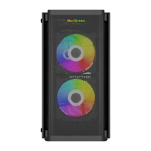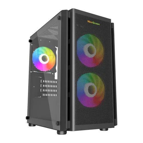 The MaxGreen 5510-Mesh Mid-Tower M-ATX Gaming Case is the ultimate choice for gamers and PC enthusiasts seeking a blend of style and performance. This sleek case supports M-ATX motherboards and features a robust cooling system with three pre-installed ARGB fans, ensuring optimal airflow during intense gaming sessions. Its tempered glass side panel showcases your components, while the front panel offers convenient connectivity with USB, and HD audio ports. With a built-in 200W PSU and a compact yet spacious design, the MaxGreen 5510-Mesh combines aesthetics, functionality, and convenience, making it the perfect foundation for an exceptional gaming rig.
