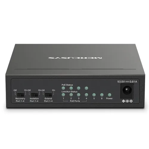 | Interface | 6× 10/100 Mbps Ports, Auto-Negotiation, Auto MDI/MDIX with 4-Port PoE+ | |