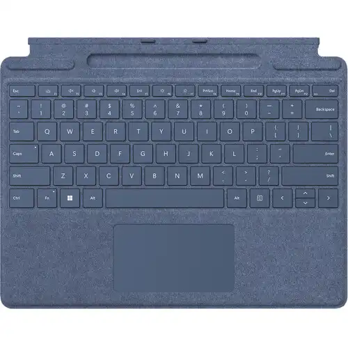 The Microsoft Surface Pro Signature Keyboard Sapphire is a premium accessory designed to transform your Surface Pro 8, Pro 9, or Pro X into a full-featured laptop with style, comfort, and functionality. This Microsoft Surface Pro Keyboard is wrapped in luxurious Sapphire-colored Alcantara, a partially biobased material made from renewable resources, offering a soft, warm, and durable surface that enhances the typing experience. The Surface Pro Signature Keyboard features a full mechanical keyset with backlit keys for effortless typing in any lighting condition, along with a large precision glass touchpad for smooth and accurate navigation. It magnetically attaches to your Surface Pro, instantly converting it into a stable and responsive workstation, whether you're working at a desk or on the go. The keyboard also includes a built-in storage tray that securely holds and wirelessly charges the Surface Slim Pen 2 (sold separately), ensuring your pen is always ready for note-taking, sketching, or marking up documents. Designed for seamless integration with Windows, this Surface Pro Signature Keyboard Sapphire supports Bluetooth connectivity and includes dedicated keys for shortcuts, media controls, and screen brightness. Lightweight and ultra-slim, it maintains the portability of your Surface device while adding the productivity of a traditional laptop. Whether you're a student, creative professional, or business user, the Microsoft Surface Pro Signature Keyboard Sapphire delivers a refined typing experience, intelligent design, and premium materials that make it an essential companion for maximizing the potential of your Surface Pro.
