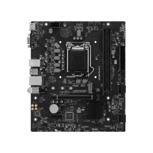 The MSI H510M PLUS II Motherboard is a dependable and cost-effective alternative for building a compact yet powerful desktop computer, providing the key capabilities required for smooth gaming, productivity, and everyday use. It is powered by the Intel H510 chipset and supports 10th and 11th-generation Intel Core processors, as well as Pentium Gold and Celeron CPUs, allowing consumers flexibility across various system designs. Memory compatibility includes two DDR4 slots with dual-channel capabilities, allowing for a maximum capacity of 64GB. Depending on the CPU installed, the MSI H510M PLUS II Motherboard supports speeds of up to 2933MHz for Intel Core i9 and Core i7 processors and up to 2666MHz for Core i5, Core i3, Pentium Gold, and Celeron CPUs, with Intel Extreme Memory Profile (XMP) support for easy overclocking. Onboard graphics include HDMI 1.4, which supports 4K resolution at 30Hz, and a VGA output with resolutions up to 2048x1536, though availability varies depending on the CPU used. For expansion, the board has one PCIe 3.0 x16 slot for a dedicated graphics card and one PCIe 3.0 x1 slot for other devices. Storage is handled by a fast M.2 slot that supports PCIe 3.0 x4 and SATA modes, as well as four SATA 6Gb/s connectors. The MSI H510M PLUS II Motherboard supports both SSDs and traditional hard drives. The audio system uses the Realtek ALC897 codec to provide 7.1-channel high-definition sound, which improves entertainment and gaming experiences. Connectivity is practical, with four USB 2.0 connections on the back and four on the front, as well as two USB 3.2 Gen1 Type-A connectors on both the front and back for fast transfers. MSI H510M PLUS II Motherboard's networking is powered by Realtek 8111H Gigabit LAN for reliable wired connectivity. Additional internal I/O includes CPU and system fan headers, RGB lighting, chassis intrusion detection, COM port, TPM 2.0, and front audio. EZ Debug LEDs are a useful feature that makes troubleshooting easier. The MSI H510M PLUS II, with a tiny micro-ATX form factor of 202mm x 236mm, is compatible with Windows 10 and Windows 11, making it a reliable motherboard that balances performance, expandability, and value for budget-conscious consumers.